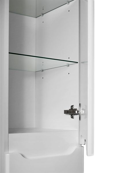 Пенал для коллекций Q, Laguna, Tiny, Mini. Фасад белый лак МДФ. Стеклянные полки с возможностью перестановки полок по высоте. Подвесной/напольный. В комплект для установки на пол нужно докупить ножки QL. Левый/Правый (перевешиваются дверцы)