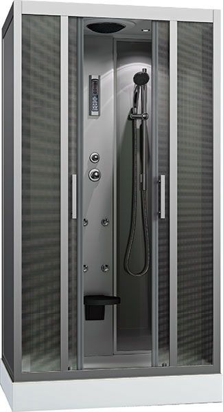фронтальные стекла матовые фактурные задние стекла матовые «серебро» центральная панель пластик «серебро» с сиденьем хромированный алюминиевый профиль регулируемые ролики хромированные ручки для дверей 3-х режимный смеситель ручная лейка на штанге 4 гидромассажных форсунки верхняя лейка «тропический душ» стеклянная полка пульт управления с функциями: радио, свет, вентилятор слив нажимной «click-clack» с сифоном