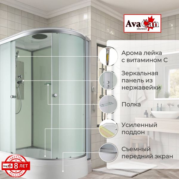 Стильная душевая кабина AvaCan D 3012L сочетает в себе высокую функциональность, практичность и надежность. При изготовлении применяется безопасное закаленное стекло толщиной 4 мм (матовое), надежно фиксируемое алюминиевым профилем. Сборка без силикона (увеличивает срок службы), внутренняя сборка (облегчает установку и ревизию, позволяет установить душевую кабину в ограниченном пространстве),смеситель резьбовой (без хомутов), съемный экран поддона (позволяет осуществлять ревизию сифона), цвет профиля матовый хром. Двойные металлические ролики дверей (увеличивают срок службы).В комплекте : душевая штанга, полочка, тропический (верхний) душ, арома-лейка с витамином С (картридж съемный).