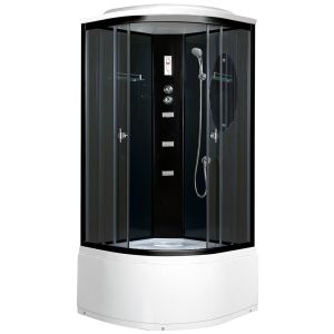 Поддон акриловый высокий 48см(сиденье на поддоне),глубина 30см, сифон с гофрой,экран съемный,профиль черный,центральная панель черная, задние стенки закаленные,черные, крашенные, передние стекла закаленные,тонированные, смеситель 3-х режимный, полочка,пульт, подсветка, верхний душ,ручной душ,зеркало,гидромассаж