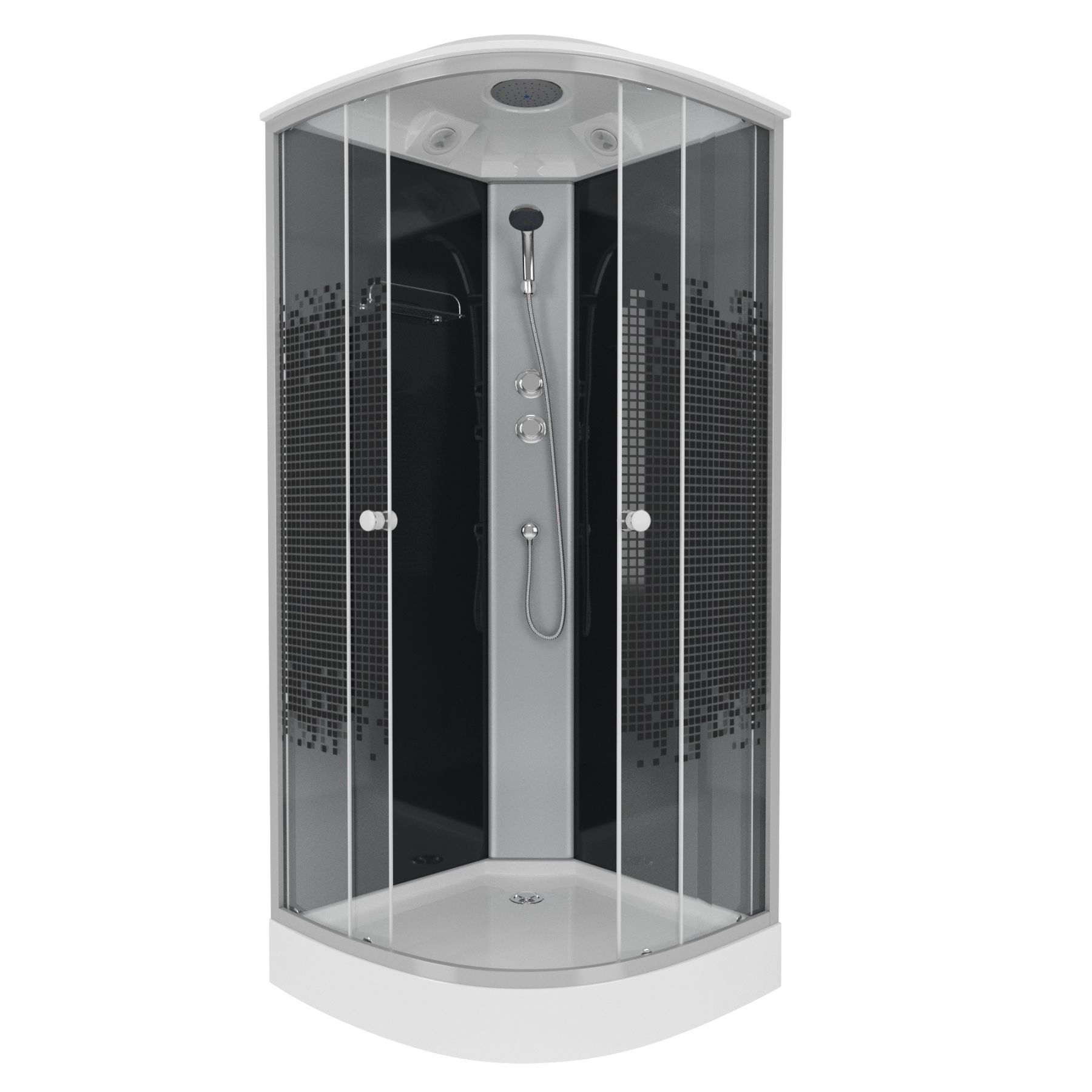 передние стекла прозрачные, рисунок-мозаика, вентиляция, смеситель 2-х режимный, тропический душ, ручной душ, одинарные ролики.