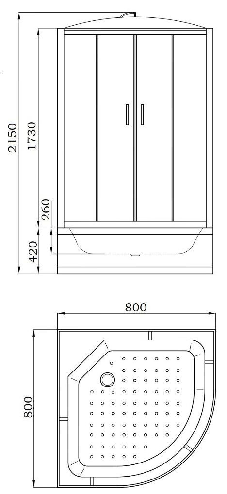 • Поддон: высокий 42 см, полукруглый, рельефное дно, литое сиденье.