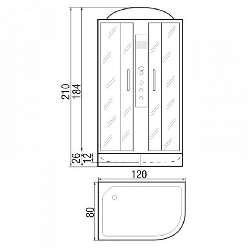 ~ крыша ~ верхний душ ~ верх. свет ~ динамик ~ вентилятор ~ цент.стойка ~ пульт упр-я ~ радио ~ телефон ~ смеситель с переключ. режимов ~ 3 г/м форс. ~ штанга ~ ручной душ 3х режимн. ~ зеркало ~ полочка ~ поддон п/кр. низ.с/съем. экр.(Н=26см) ~ сифон