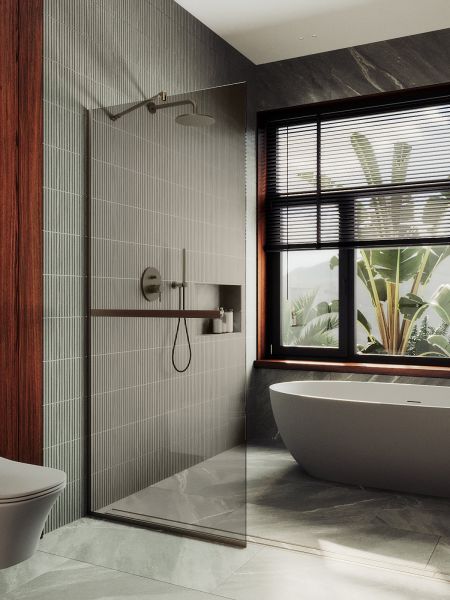 Душевая перегородка в профиле с полотенцесушителем представляет собой компактное и функциональное решение для разделения пространства в ванной комнате . Она изготовлена из закаленного стекла,анодированного алюминиевого профиля, что обеспечивает прочность и долговечность конструкции. Закаленное стекло , цвет бронза , толщина 8 мм , 1950*790-1 шт.