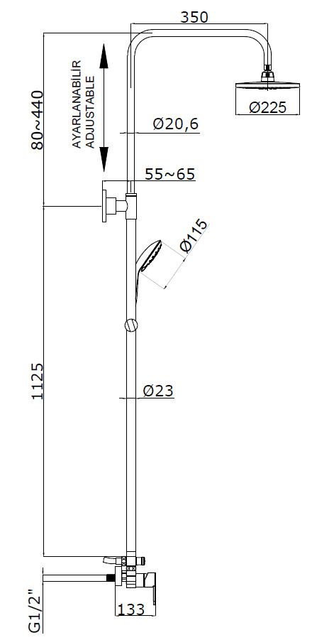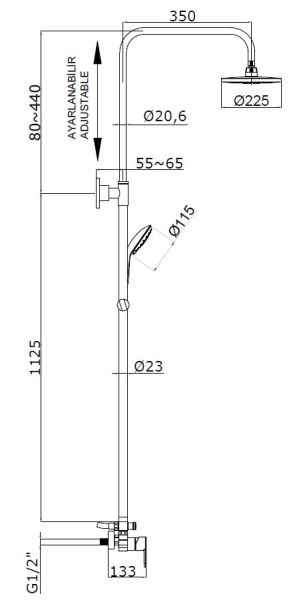 - Размер верхнего душа, см:225