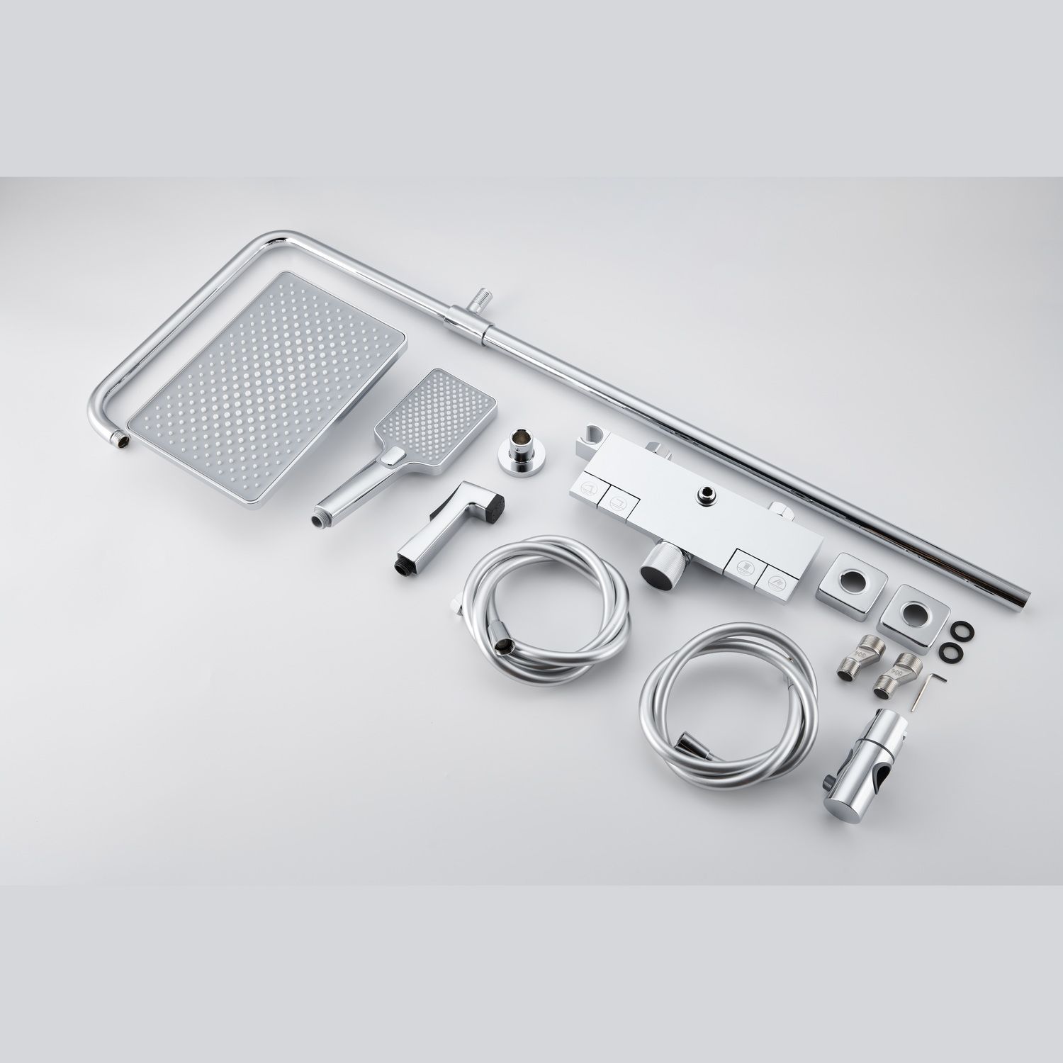 Из потребителей на системе установлен ручной режимный и верхний душ, а также излив скрытой установки и гигиенический душ. Выбор потока осуществляется через клавиши расположенные сверху корпуса смесителя.