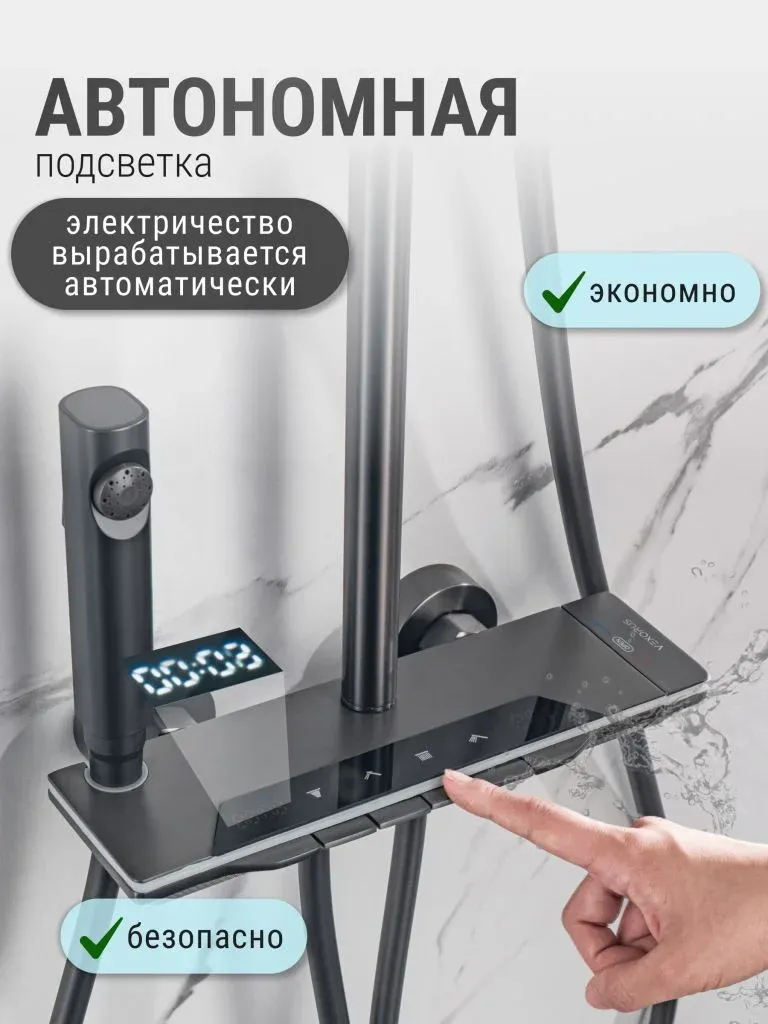 Душевой комплект содержит все необходимое для монтажа. Кроме того, наша душевая стойка с дисплеем и подсветкой имеет простой и быстрый монтаж, благодаря чему вы сможете установить ее самостоятельно без привлечения специалистов. Это позволит сэкономить время и деньги, а также получить удовольствие от процесса создания своего уютного уголка в ванной комнате.