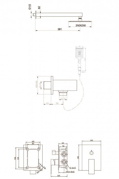 Оснащение: встраиваемый смеситель с переключателем на два выхода, верхний душ диаметр 25 см с изливом, ручной душ 3-х режимный со шлангом, штуцером и держателем
