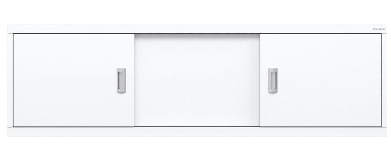 Конструкция имеет три подвижные двери из МДФ, покрытых высокоглянцевой белой пленкой. Две боковые дверцы с врезными хромированными металлическими ручками.