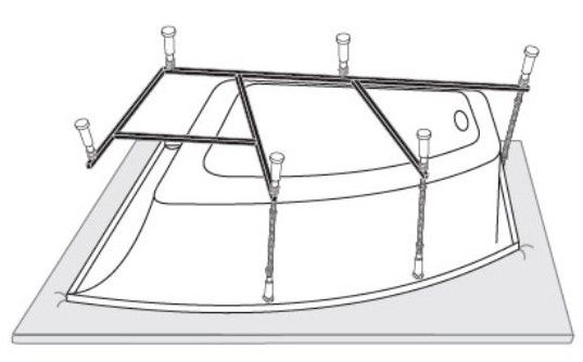 Усиленный цельносварной стальной каркас для ванны изготовлен из квадратного металлического профиля 2х2 см и окрашен темно-бронзовой молотковой краской. Каркас имеет 8 ножек и 4 опоры в борт ванны снизу. Предназначен для использования во влажных помещениях.