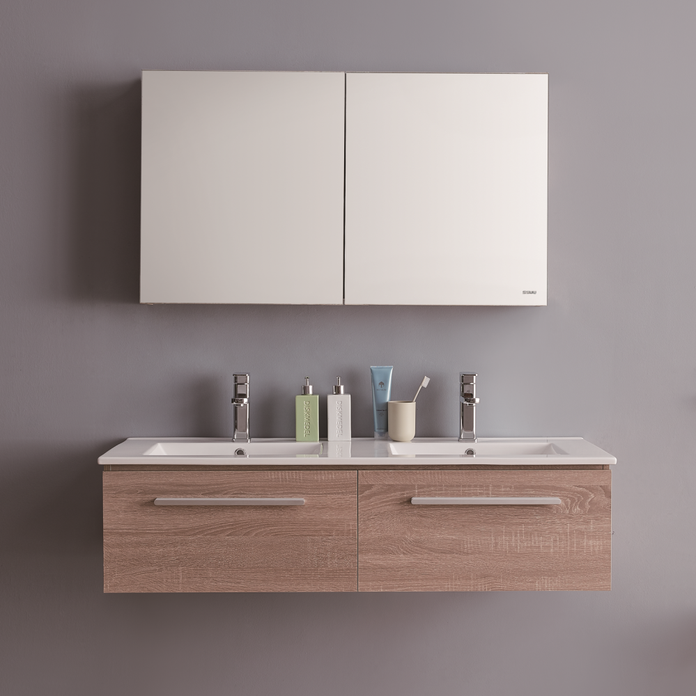 1. Многослойное дерево, 2. Два выдвижных ящика с доводчиками 3. Цвет: темный дуб . 4.Зеркальный шкаф 5.Раковина в комплекте.