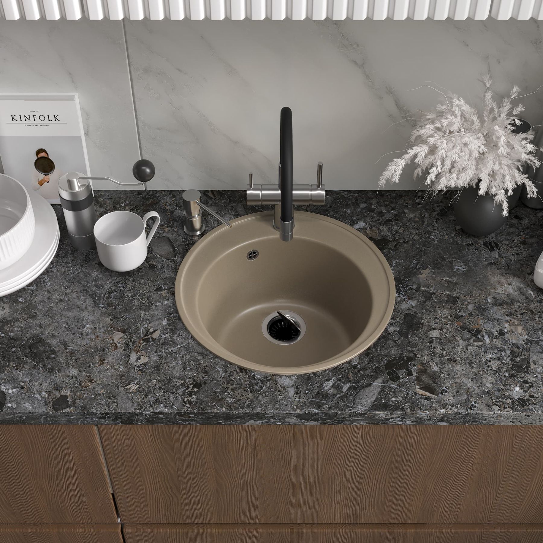 В мойке предусмотрено отверстие для установки смесителя. Используя алмазную коронку, можно сделать дополнительные отверстия для дозатора жидкого мыла или сифона с полуавтоматом.