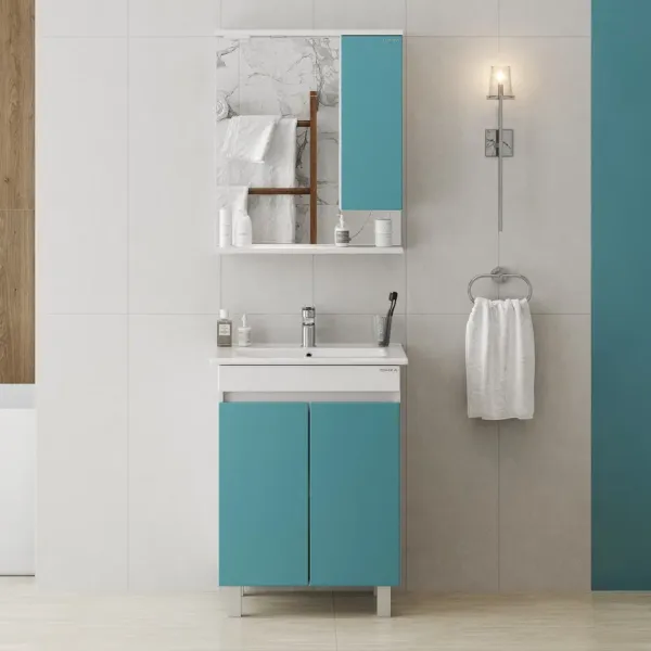 Напольная тумба Марви 60 нежного бирюзового цвета добавит интерьеру ярких красок и придаст ванной комнате ощущение свежести, чистоты и уюта.