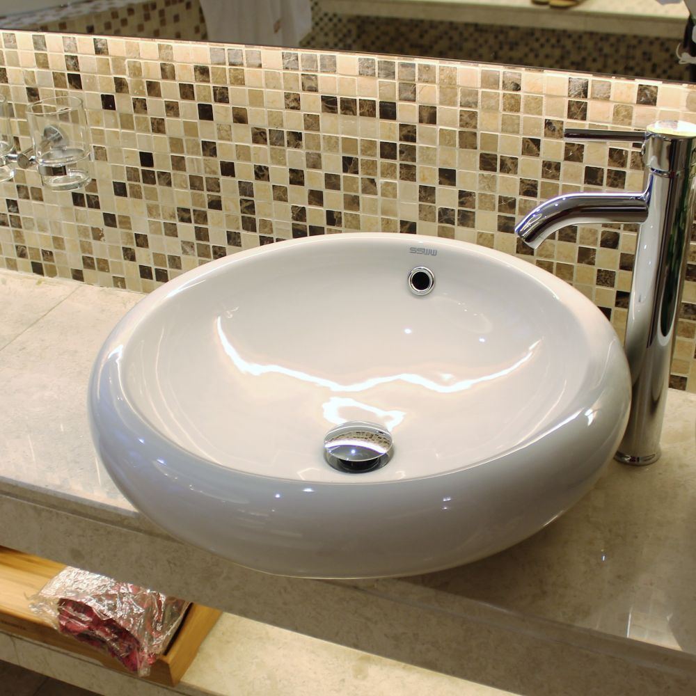 Накладная раковина круглая, цвет белый, без отверстия под смеситель, с приливным каналом