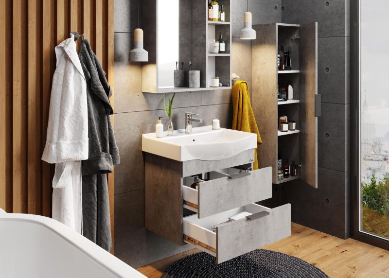 Навесной зеркальный шкаф для ванной комнаты Onika ДЕВИС 65 отличается чёткой геометрией форм и создан для тех, кто ценит современный лаконичный дизайн, холодный брутальный эффект бетона, а также безупречное исполнение.