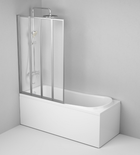 Душевая штора обладает уникальной конструкцией, позволяющая регулировать положение и размер.Складная душевая шторка на борт ванны, состоит из четырёх частей.