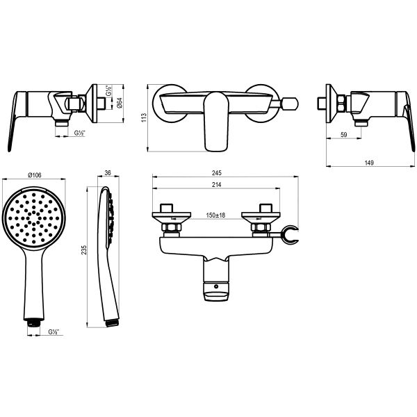 • Аксессуары в комплекте: 1-функциональная лейка Ø106×235 мм, душевой шланг 1,5 м