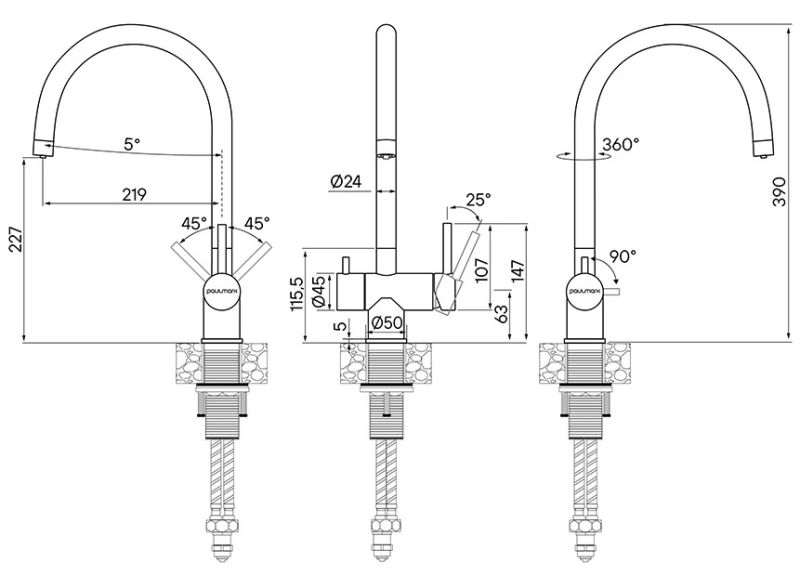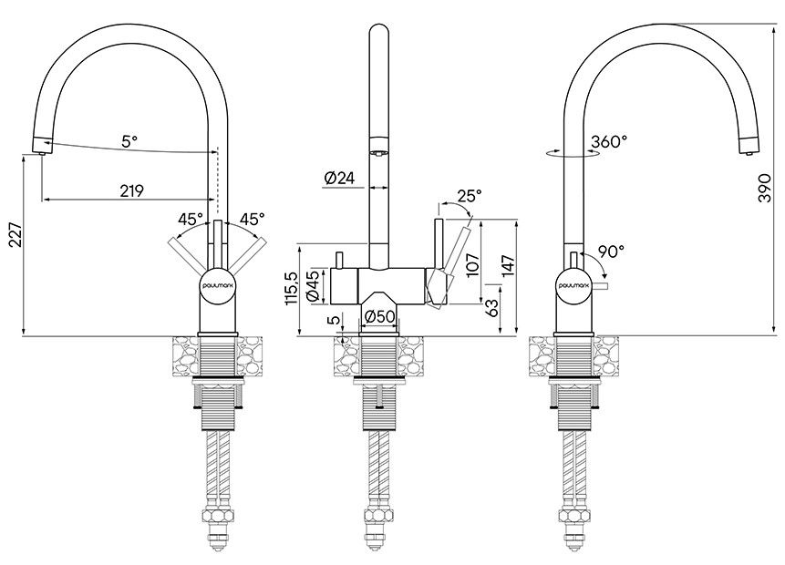 Конструктивная технология Trinkwasser® предусматривает поступление фильтрованной воды, которая не смешивается с водопроводной. Фильтрованная вода подается через отдельные трубку и аэратор.