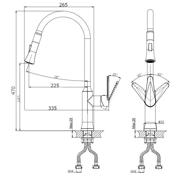 Смеситель для кухни RUSH арт. DN0335-23 с поворотным изливом и вытяжной лейкой из коллекции Denis с металлической ручкой, изготовлен из высококачественной латуни и имеет рычажное управление.В смеситель установлен картридж D-35 с керамическими пластинами. Высота смесителя 486 мм. Излив поворотный 225 мм. Высота излива до аэратора 245 мм. Аэратор изготовлен из пластика с нержавеющим корпусом, угол наклона аэратора-18гр.В комплекте универсальная присоединительная группа для установки на горизонтальную поверхность, гибкая подводка с латунными гайками 40 см - 2шт, фум-лента, индивидуальный пакет, паспорт, гарантийный талон.