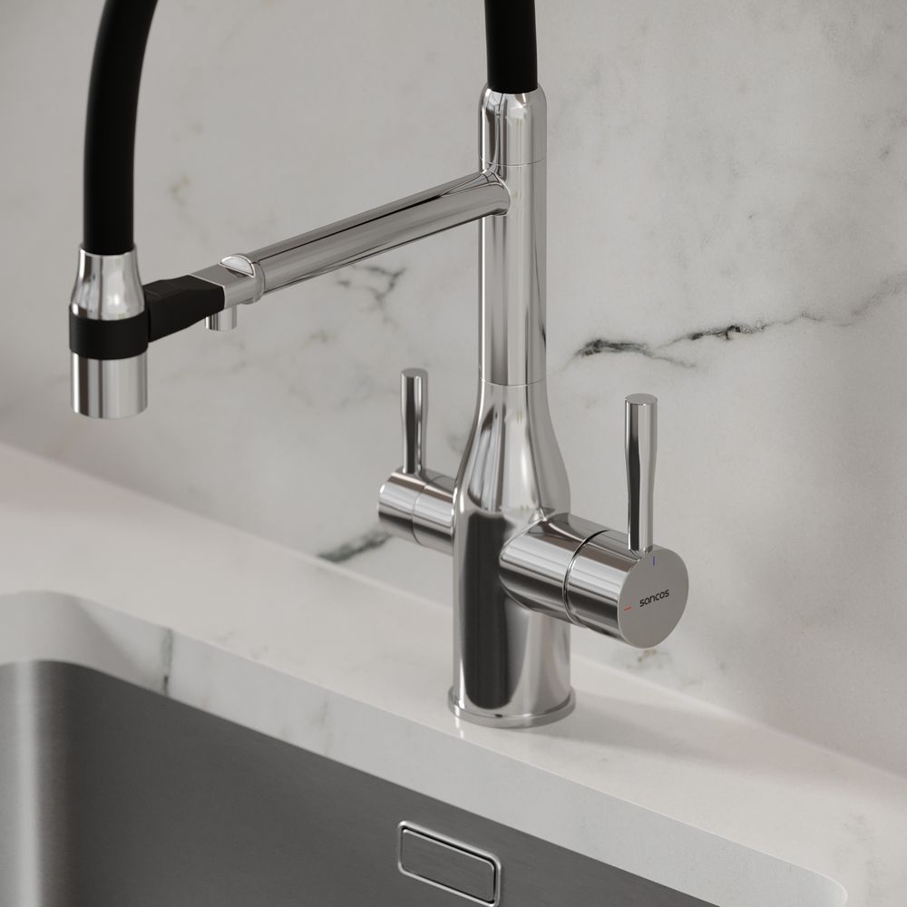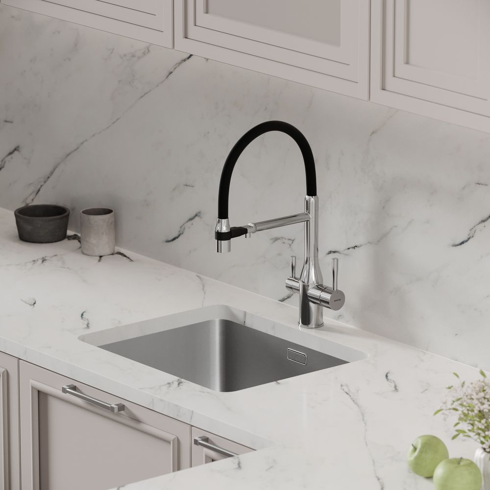 Смеситель для кухни SANCOS Garda с гибким изливом и возможностью подключения фильтра для воды, цвет хром, арт. SC4009CHФункция "Холодный старт" - при включении смесителя активируется холодной поток, для экономии горячей водыАэратор, гибкая подводка, ключ и крепления для монтажа