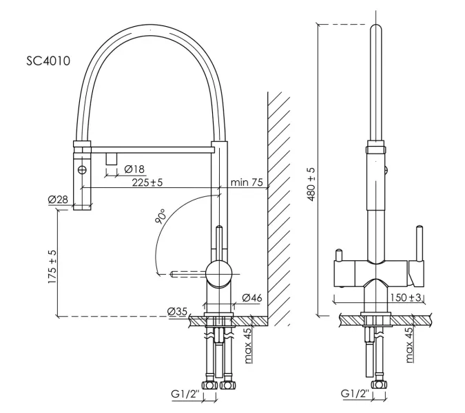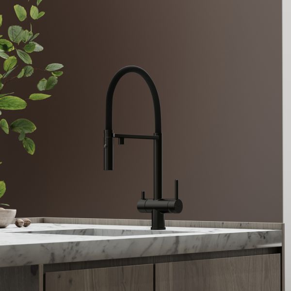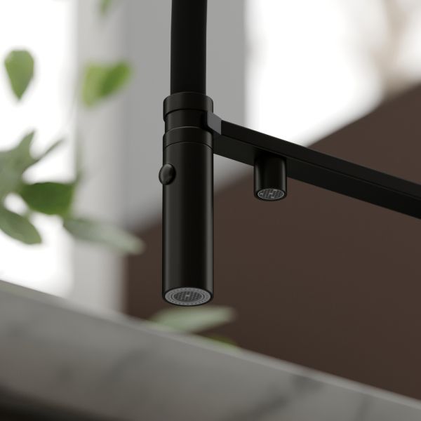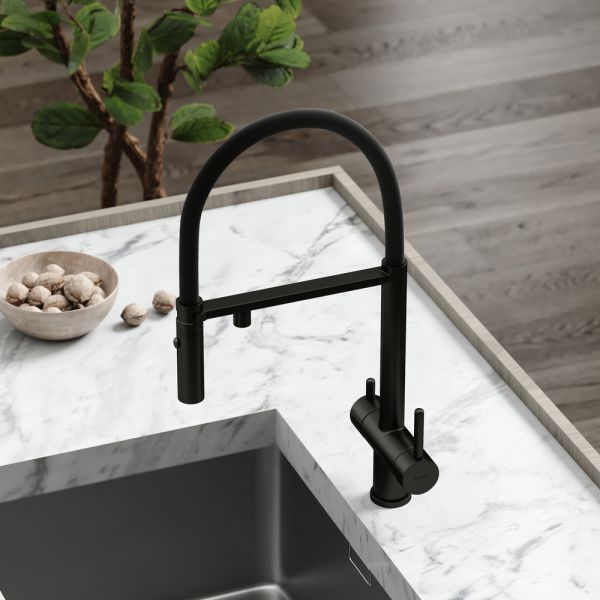 Смеситель для кухни SANCOS Imola с гибким изливом и возможностью подключения фильтра для воды, цвет матовый черный, арт. SC4010MBФункция "Холодный старт" - при включении смесителя активируется холодной поток, для экономии горячей водыАэратор, гибкая подводка, ключ и крепления для монтажа