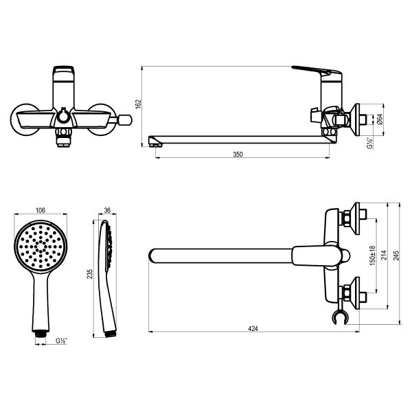 - Аксессуары в комплекте: 1-функциональная лейка Ø106×235 мм, душевой шланг 1,5 м