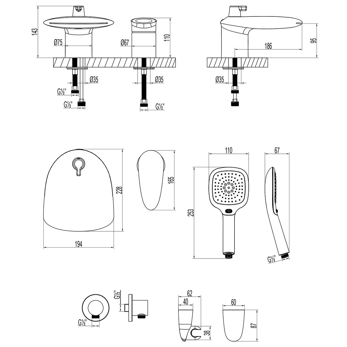 - Аксессуары в комплекте: душевой шланг 2 м, 3-функциональная лейка 111х253 мм