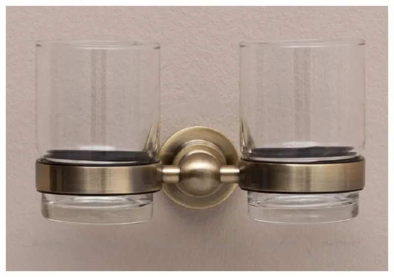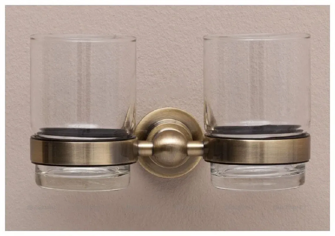 Стакан Aquanet 3884D (двойной) выполнен в ретро-стиле. Колорит изделию придает золотисто-медный оттенок латуни и живописные элементы декора. Одним из таких элементов служит оригинальной формы деталь, которая является одновременно креплением аксессуара к стене, в которой прячутся крепежи, с другой к ней присоединяются два кольцеобразных элемента, в которых помещаются стаканы. Лаконично и эффектно. Выполнено основание модели из латуни - сплава меди с цинком. Этот материал зарекомендовал себя как надежный и стойкий к коррозии, что для влажной среды особенно актуально.
