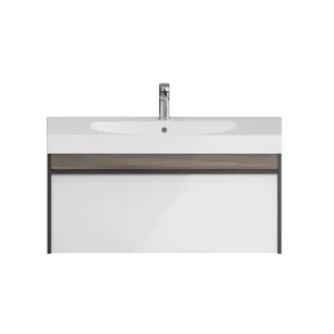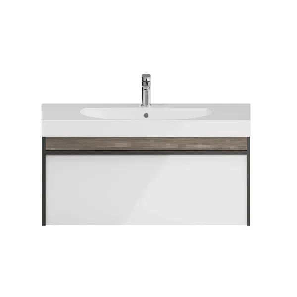 Мебель MODULA может быть использована для установки как мебельных раковин, так и любой из накладных, которые в этом случае устанавливаются на керамическую столешницу CANALETTO. Боковины тумбы выполнены в цвете «Арабика», фасад — белый глянцевый.
