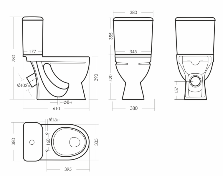 Размеры унитаза-компакта: 380 x 610 x 780