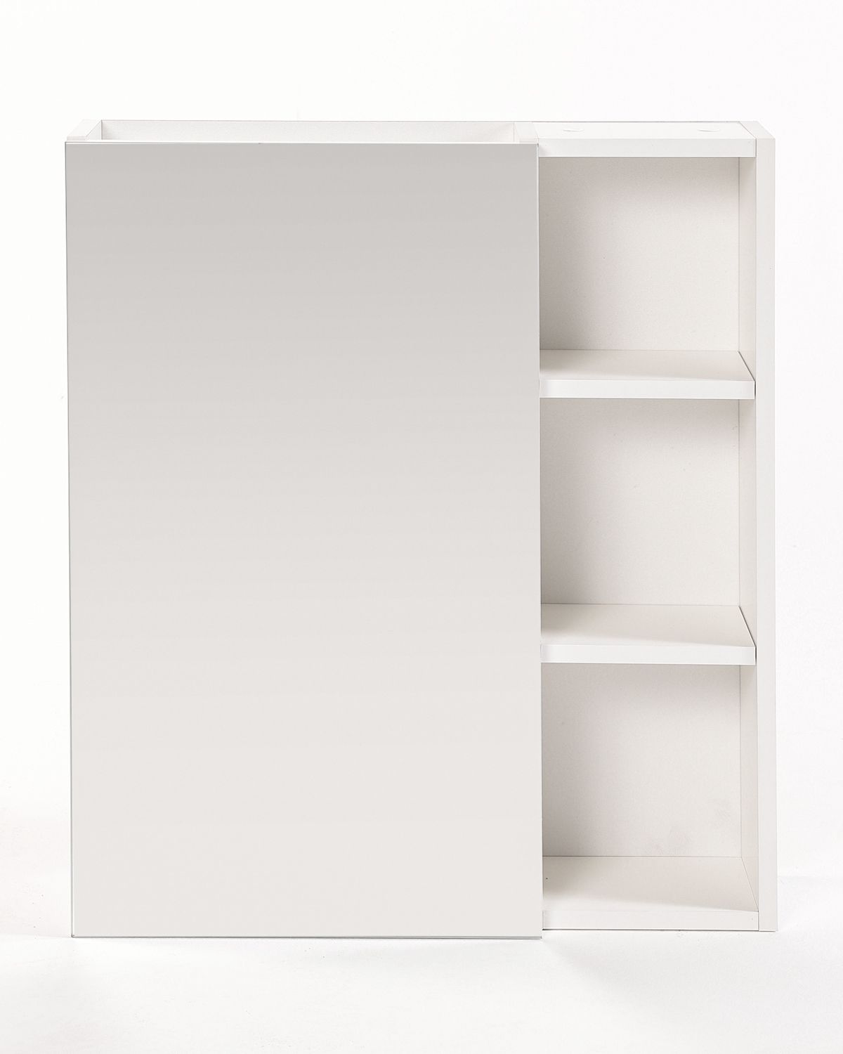 Зеркальный шкаф универсальный. Фасад зеркальное полотно, корпус - ЛДСП в цвете матовый белый. Дверца с механизмом доводчика, обеспечивающим плавное закрывание. В комплекте внутренние полочки (ДСП) - 4 шт.
