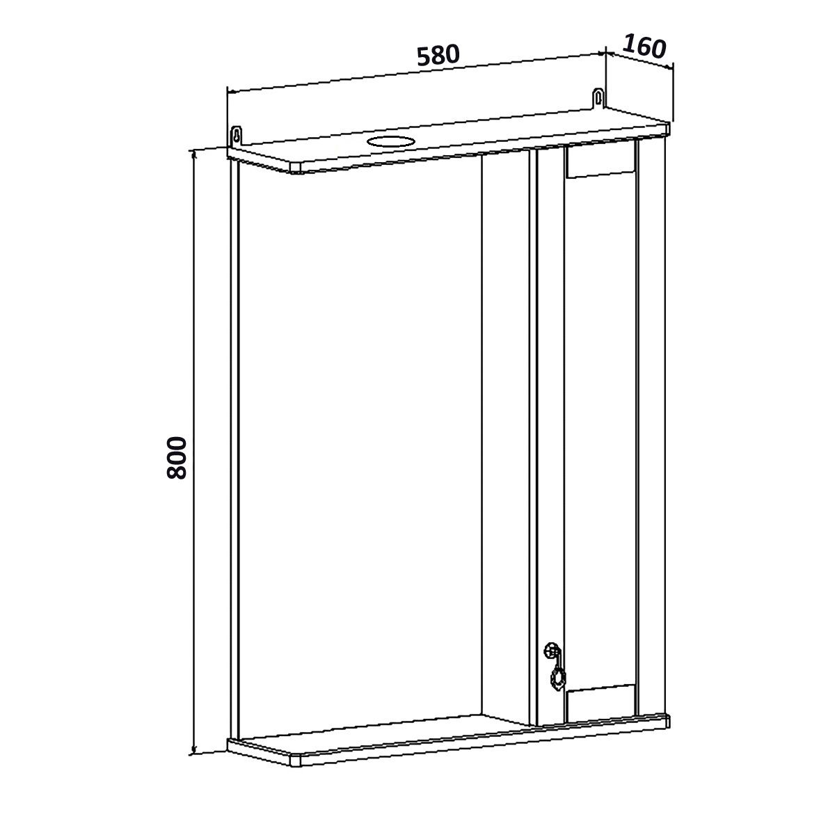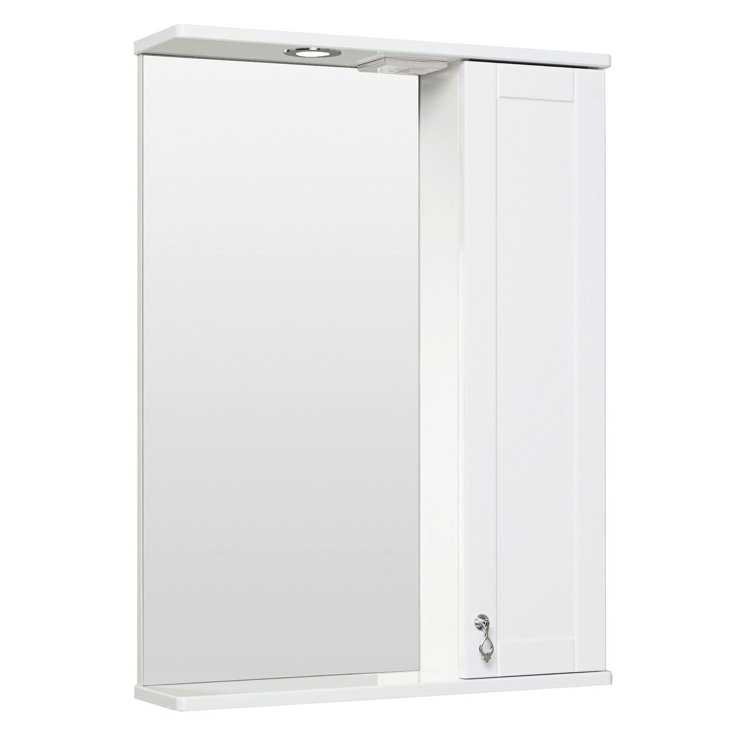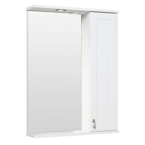Зеркальный шкаф оборудован одним врезным светодиодным светильником 220В и розеткой с выключателем. Справа - шкафчик с распашным фасадом и двумя внутренними полками. Петли со встроенным доводчиком, ручка - 1шт. Выпускается только в правом исполнении.